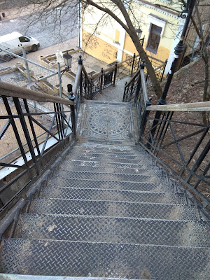 Прохожу мимо кормящихся и только решила сфотографировать старую лестницу к монастырскому кладбищу, по которой так страшно было ходить в детстве, и по которой быстро бежали перекурить в юности. На лестничке стоят два .... человека мужского пола, скажу проще - нарика. Один вскрывает шприц, а обертками от них все кругом завалено, другой ждет, терпеливо. Первый-дилер держит шприц во рту и отворачивается от меня, когда я прохожу мимо. А справа идет еще парочка молодых людей в моем направлении.