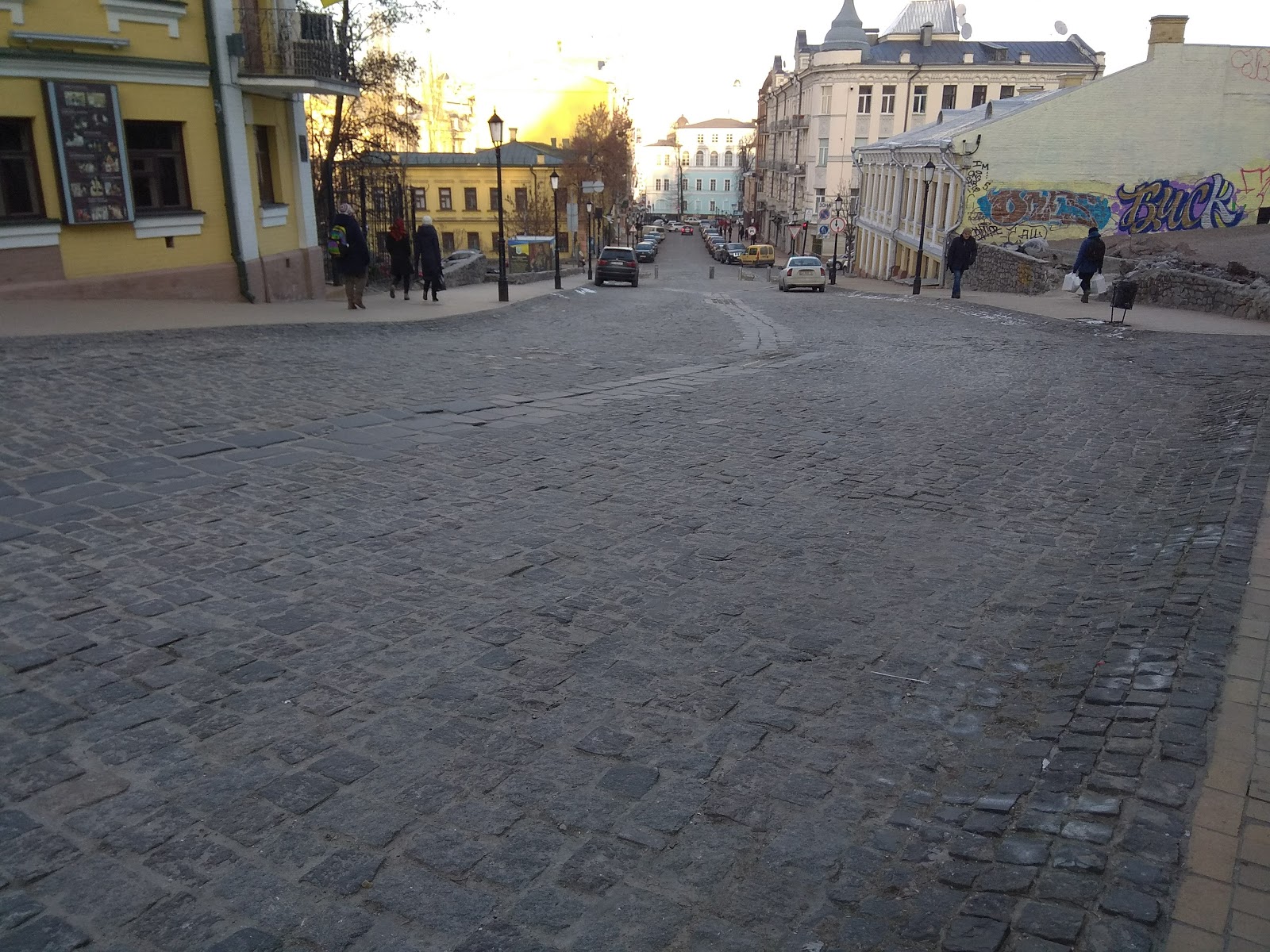 По Андреевскому спускались на санках. Причем чем старше ты был, тем с более высокой точки летел. Начинали от Андреевской церкви, заканчивали у Дворца пионеров, бывшей школы №20.
